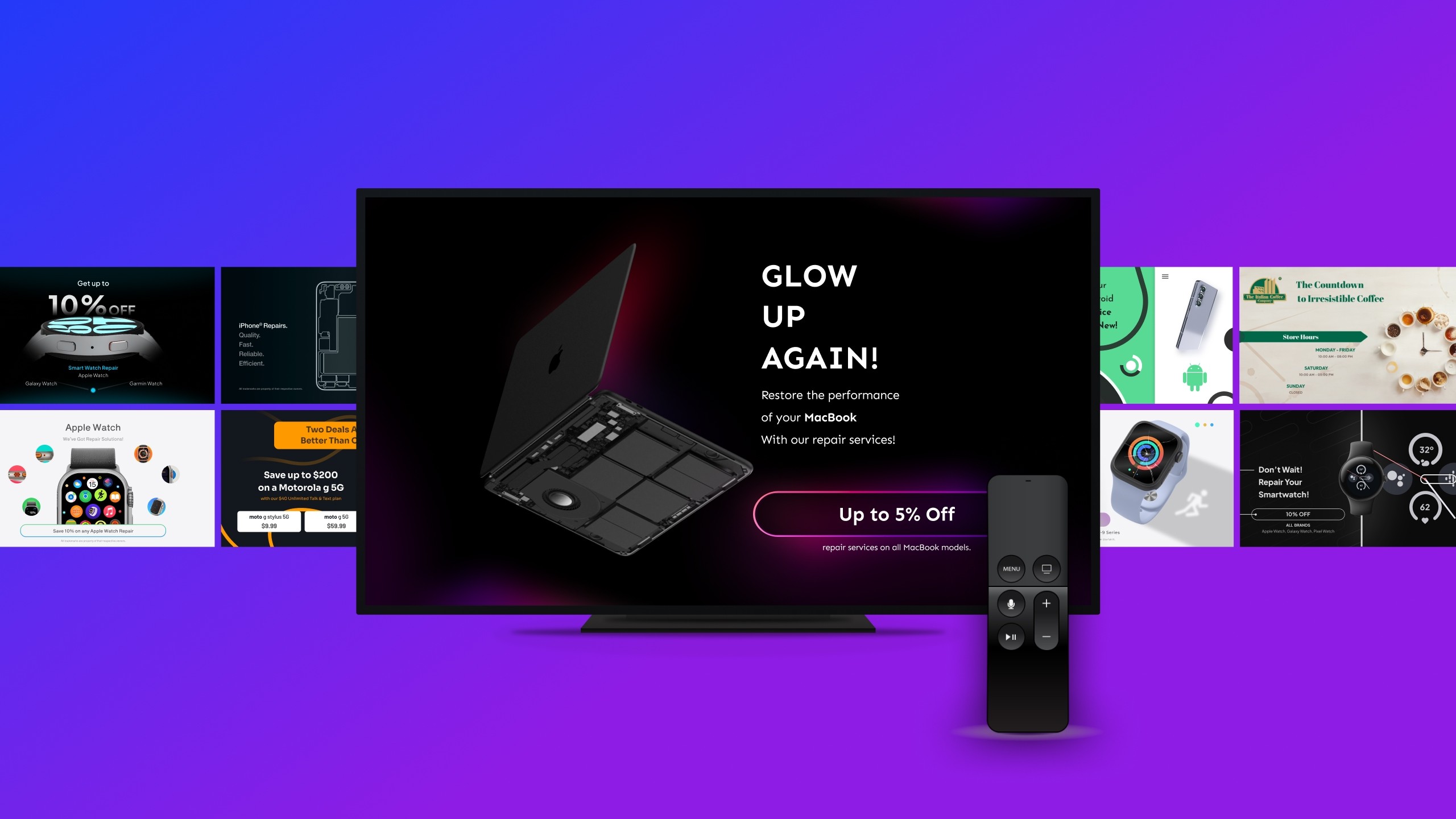 Designed visually engaging assets for CPR Cell Phone Repair's social media platforms, as well as GIFs and graphics for AdCentral's email marketing campaigns.